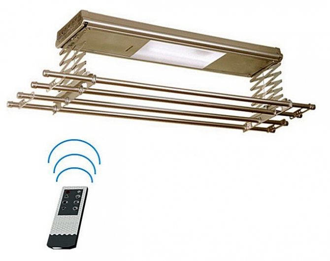 Contrôle manuel. Pour abaisser la barre horizontale, desserrez le verrou et allongez le cordon de travail. La tige est abaissée à une hauteur pratique pour suspendre le linge. Ensuite, le cordon est tiré et fixé - la barre transversale, avec les choses, monte au plafond.En conséquence, les vêtements ou les draps ne créent pas d'obstacles au mouvement, car ils se trouvent dans une bonne zone généralement inutilisée.
