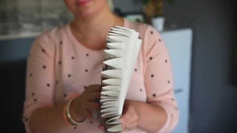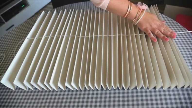 - Le matériau est plié comme un accordéon de sorte que la largeur d'une "lamelle" soit de 3 à 6 cm. Ensuite, le produit semi-fini est essayé sur la fenêtre, l'excédent est coupé. L'accordéon est plié. Des trous sont réalisés au centre des bandes pliées avec une perforatrice.