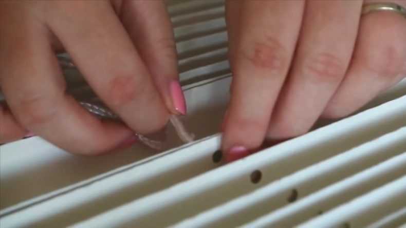 Vous aurez besoin d'un tournevis pour retirer le bouchon en plastique qui se trouve sur le filetage. Le nœud sur le fil peut être dénoué ou simplement coupé, et le fil lui-même peut être retiré le long de la lamelle souhaitée, inclusivement des deux côtés de la toile. Une nouvelle bande est insérée dans le sens opposé, après quoi toutes les lattes retirées sont remises en place, un bouchon et un nœud sont noués. Le bouchon est installé dans le trou de la corniche inférieure. Toutes les manipulations sont effectuées de l'autre côté. La même méthode est utilisée lorsqu'ils veulent simplement raccourcir une toile trop longue de stores horizontaux.