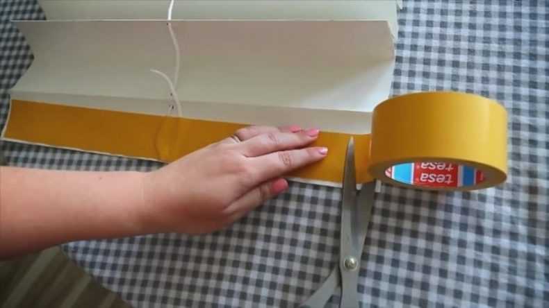 - Une corde est enfilée dans les trous résultants, la section est fixée sur le dessus avec le même ruban. Le surplus est coupé. Du ruban adhésif double face est collé sur le dessus de l'accordéon. Le scotch est collé sur le bord inférieur de sorte que la moitié de sa largeur reste libre.