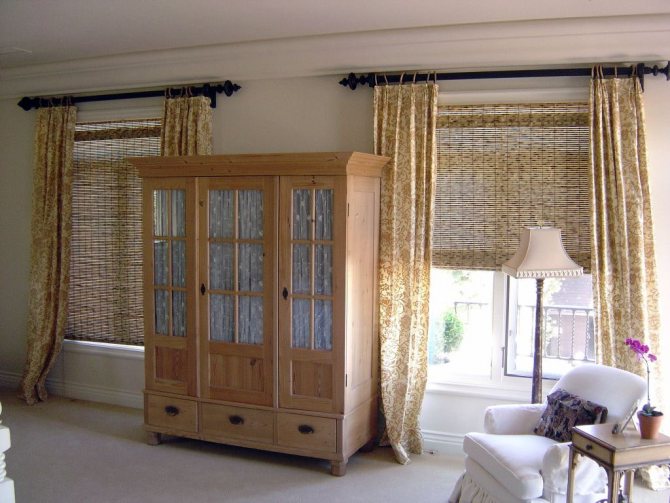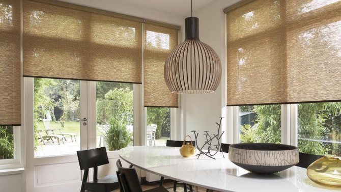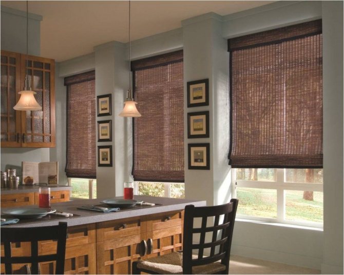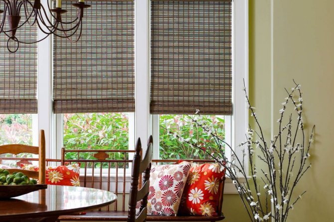 Certains artisans créent des stores en bambou ou en bois. Ces rideaux ont l'air élégant, cependant, en raison de leur poids impressionnant, ils causent beaucoup d'inconvénients à leurs propriétaires: étant en mouvement à cause d'un courant d'air, ces conceptions créent beaucoup de bruit, ce qui devient très vite ennuyeux. De plus, ce matériau respectueux de l'environnement ne peut pas se vanter d'un large assortiment de couleurs.