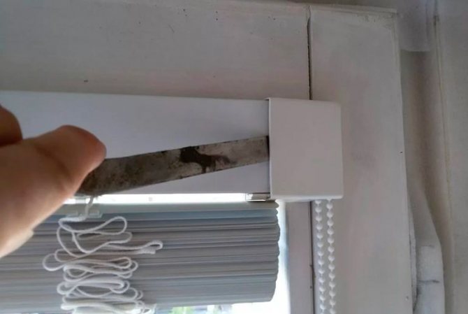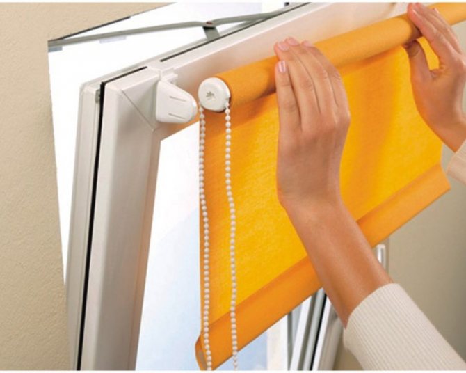 - Ensuite, vous devez soulever toutes les feuilles de stores et les tenir d'une seule main (si vous avez des stores à enrouleur ou des stores horizontaux). Un autre devra en même temps trouver les saillies sur le boîtier de fixation, il est situé au bord supérieur de la structure.