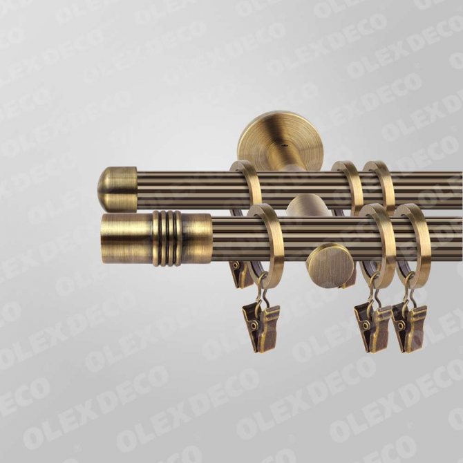 - Baguette. Tous les éléments de la corniche, tuyaux ou cordes, attaches, supports sont cachés derrière une visière décorative.Ce détail peut être de n'importe quelle forme, couleur, texture et motif. Les profils de ces produits peuvent être à une rangée, à deux rangées et à trois rangées.