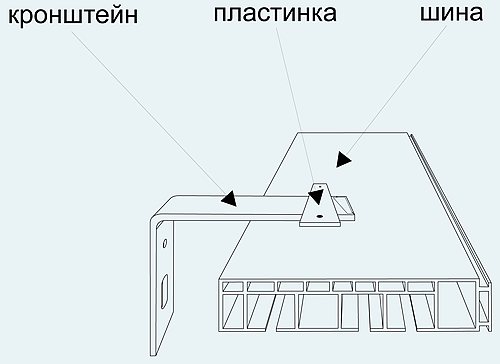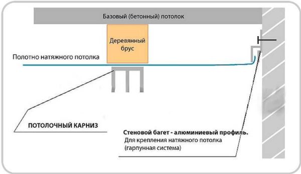 Si le plafond est abaissé non pas de 5 à 7 cm, mais à une plus grande distance, plusieurs barres ne doivent pas être fixées. Dans ce cas, les supports métalliques sont vissés à la base (plancher de base), et à eux un petit morceau de bois ou de contreplaqué épais. Le bord inférieur du bois / contreplaqué doit être aligné avec le plafond tendu / faux.
