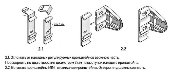 2.3. Marquez les emplacements de montage proposés pour les supports. Les supports doivent être installés horizontalement. Fixez les supports avec des vis de manière à ce que les saillies sur les supports du capuchon pour la fixation du profilé supplémentaire soient situées en bas.