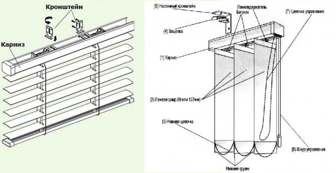 Les lamelles des stores horizontaux sont en plastique, en bois et en métal. Quels que soient le type et le matériau, ils se composent de corniches et de lamelles. Corniche - une section en U en plastique ou en aluminium dans laquelle se trouvent les commandes et à laquelle les lamelles sont suspendues. Les lamelles sont des bandes / plaques horizontales ou verticales qui recouvrent en fait l'ouverture. Afin de pouvoir ouvrir et fermer les stores, il y a des commandes - des chaînes ou des fils.
