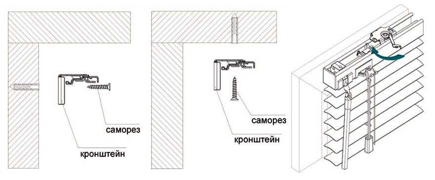 Nous insérons des chevilles d'expansion dans les trous finis, les martelons soigneusement avec un marteau. Nous mettons les supports, les fixons avec des vis ou des clous (si des clous à cheville sont utilisés). Nous installons la corniche sur les supports, insérons les bouchons sur les côtés. Pour les stores horizontaux, fixez une tige (poignée) pour contrôler le mécanisme d'oscillation. Pour ce faire, directement dans le mécanisme lui-même, installez un crochet spécial (inclus), attachez la pointe de la tige à ce crochet.