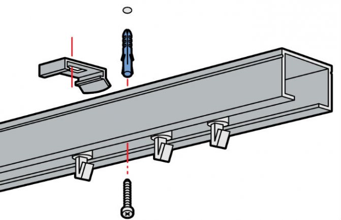 Percez des trous avec une perceuse, retirez la poussière, insérez la partie en plastique de la cheville, elle doit affleurer la surface. Fixez le support et vissez-le avec des vis autotaraudeuses. Vérifiez la géométrie de l'installation avec un niveau. Si les supports sont plats, fixez la glissière.