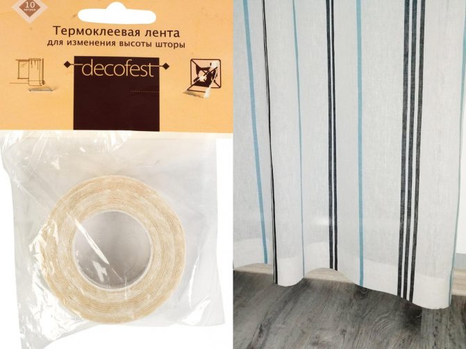 Pour ceux qui n'ont pas de machine à écrire ou le temps de coudre, il existe une solution - du ruban adhésif. Il est pratique et rapide à utiliser, aucun appareil spécial n'est nécessaire, à l'exception d'un fer et de ciseaux. Tout d'abord, mesurez la longueur et faites un pli. Ensuite, un ruban sélectionné en largeur y est inséré et repassé avec un fer à repasser. Il est impératif de respecter le régime de température, en particulier lorsque vous travaillez avec des tissus délicats. Le ruban est fin et peu visible, mais si le fer est trop chauffé, la colle sortira à l'avant du rideau.