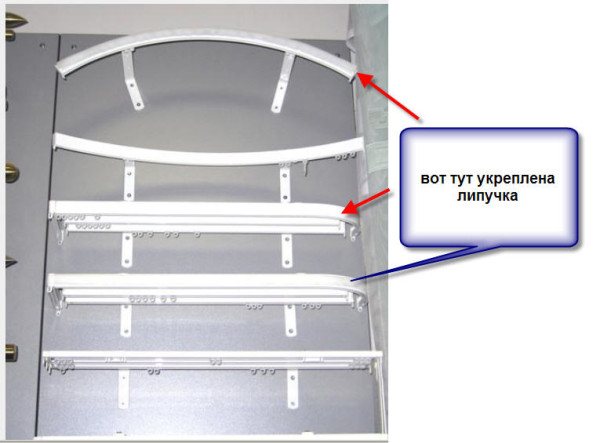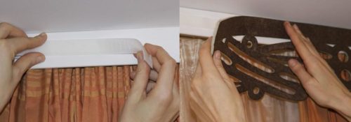 Avec ces variations, des difficultés surviendront lors de l'installation d'un lambrequin. Afin d'effectuer correctement le montage, vous devrez en plus acheter une monture. Le produit acheté est installé sur la corniche. Une installation supplémentaire est réalisée en standard - à l'aide de ruban adhésif.