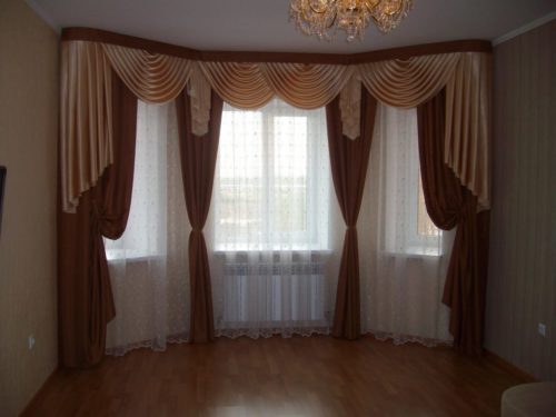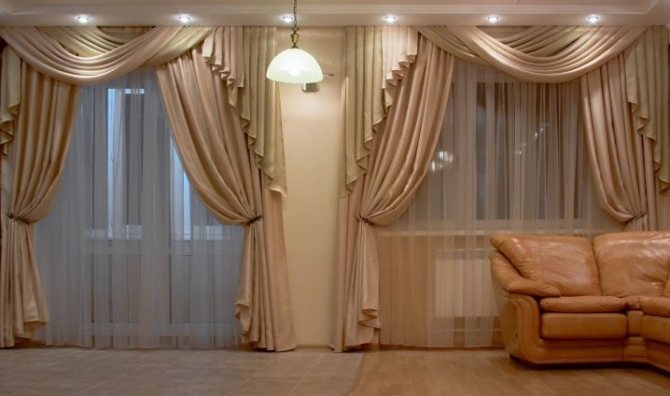 Dans les pièces avec de hauts plafonds et de grandes fenêtres, vous pouvez laisser libre cours à votre imagination et accrocher une version multicouche. Une telle composition sera le centre et la décoration de la pièce. Il peut s'agir de tulle avec des rideaux et des lambrequins.