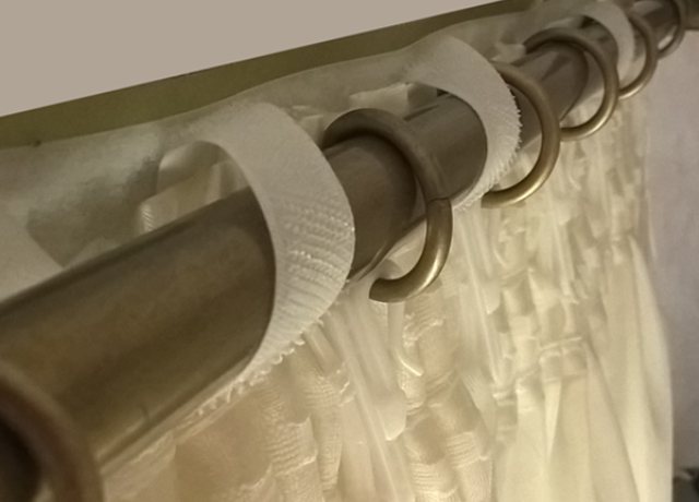 et en utilisant la première option, il y a une forte probabilité d'affaissement partiel. Le poids important des rideaux avec un élément décoratif peut aggraver la situation. La fermeture velcro est un velcro. Cette méthode de fixation permettra aux rideaux de tomber dans des plis réguliers sans défauts. Il n'est pas difficile d'utiliser du Velcro: la partie souple du Velcro doit être cousue directement sur le tissu et la partie dure doit être collée à la corniche.