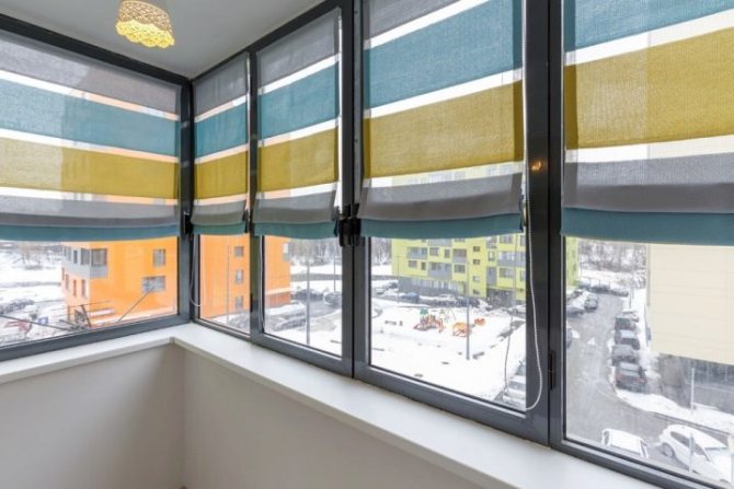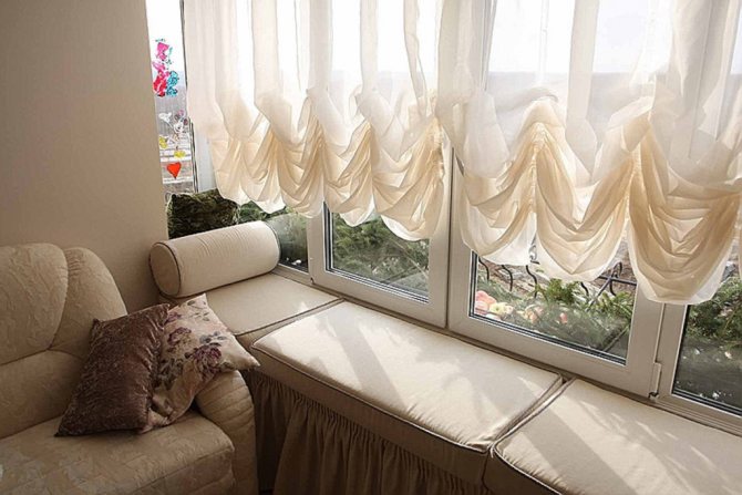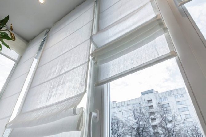 Par exemple, lorsque le rebord de la fenêtre s'étend bien au-delà du mur, des rideaux raccourcis seront la meilleure solution. Ils ne gonfleront pas. De plus, ces rideaux sont aussi concis que possible, ce qui est particulièrement important lorsqu'il s'agit de balcons compacts. Pour les loggias et les balcons, souvent ventilés, les stores romains seront le meilleur choix; ils peuvent être fixés séparément sur chaque vantail du cadre.