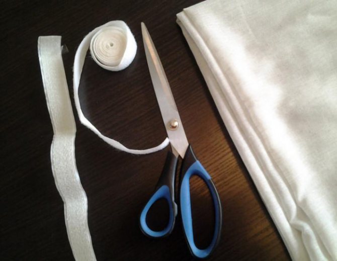 - Pour chaque rideau, vous devez coudre 4 cravates à partir du même tissu ou d'un tissu différent. Pour une cravate, vous devez prendre une coupe d'une largeur de 10 cm et d'une hauteur de rideau + 5 cm.Le bas de la cravate est cousu ensemble.
