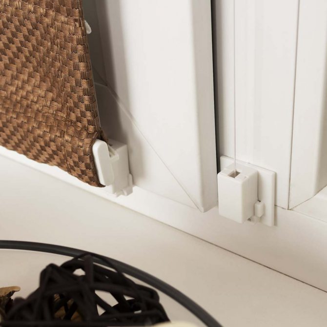 - Nous installons un crochet sur le côté du cadre de la fenêtre, qui maintiendra les nœuds sur le cordon, fixant le rideau assemblé. Le store romain sur le balcon de vos propres mains est prêt!