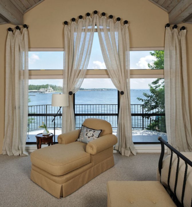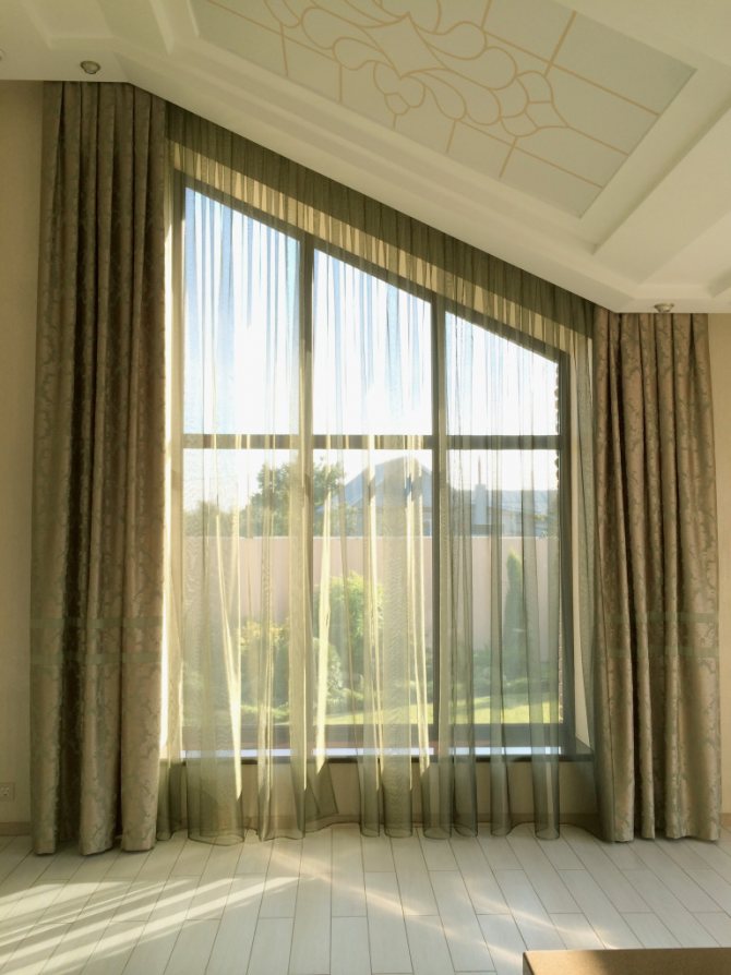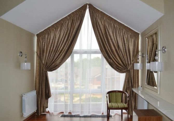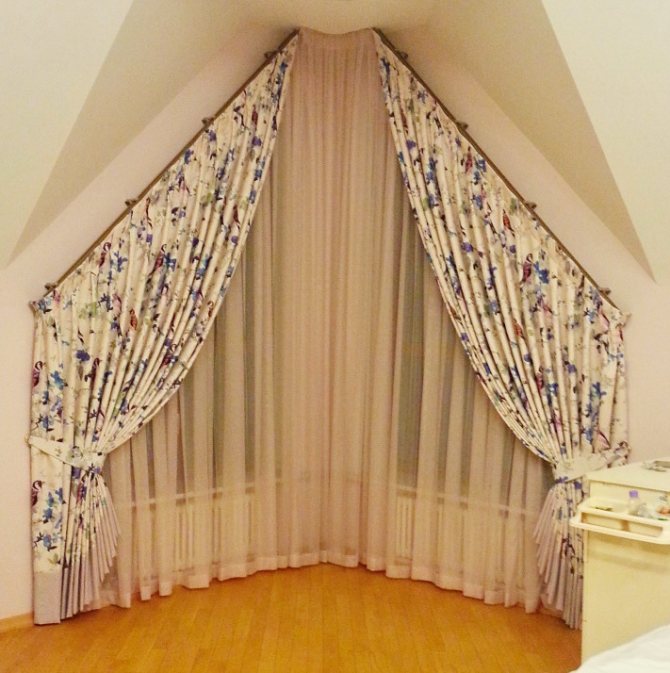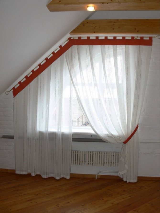 Les fenêtres à toit incliné sont conçues avec des poutres flexibles qui peuvent prendre la forme souhaitée. Ils sont également utilisés sur les ouvertures de fenêtre semi-circulaires et cintrées. Sur les structures biseautées, vous pouvez également combiner une corniche et des crochets spéciaux placés le long du biseau. Avant de coudre des rideaux, vous devez mesurer le cadre. La conception du rideau ne doit pas interférer avec le libre accès à l'ouverture de la fenêtre, interférer avec son ouverture.