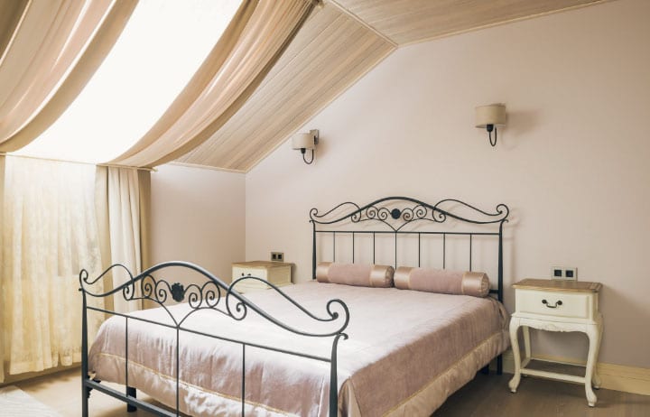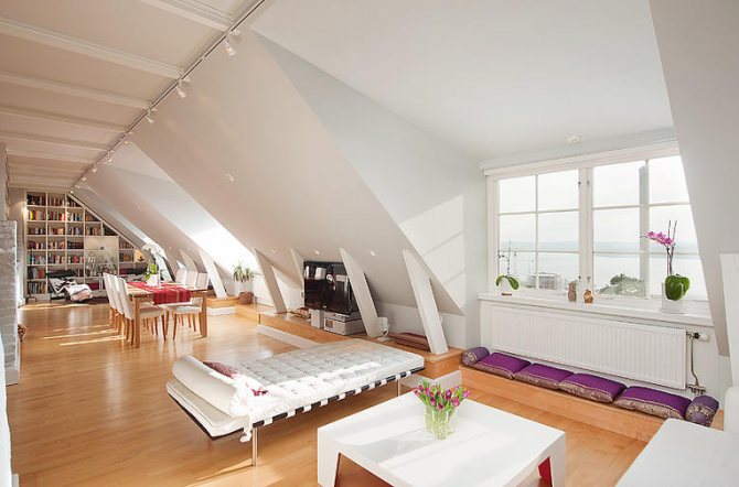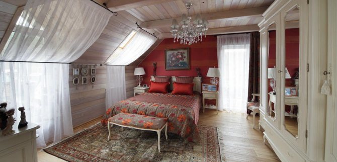 Arrêtons-nous plus en détail sur les lucarnes, qui sont situées dans le toit ou le mur du fond. Dans ce cas, la forme de la fenêtre peut être rectangulaire, ronde, carrée, triangulaire, cintrée, complexe ou aller dans un balcon. Vous devez également prendre en compte le fait que la lumière directe du soleil pénètre à travers les ouvertures des fenêtres, ce qui contribue à la décoloration des couleurs sur les meubles et la décoration de la pièce. Pour minimiser ce processus, une attention particulière doit être portée au tissu à partir duquel les rideaux seront fabriqués.