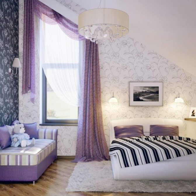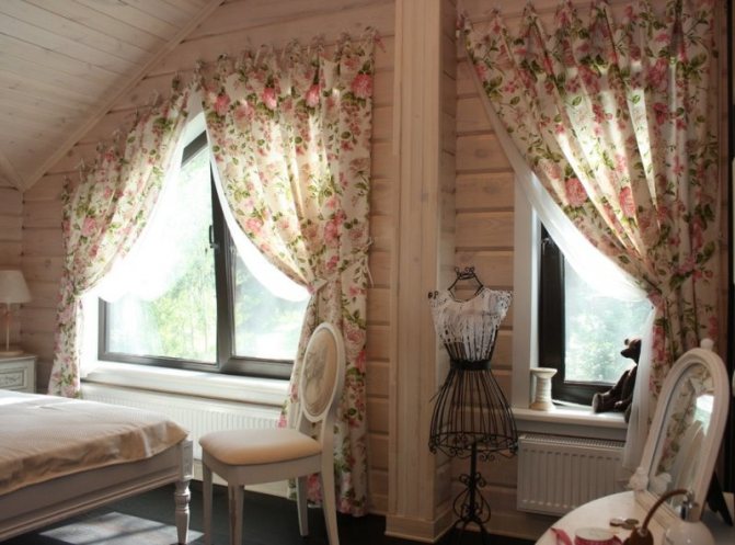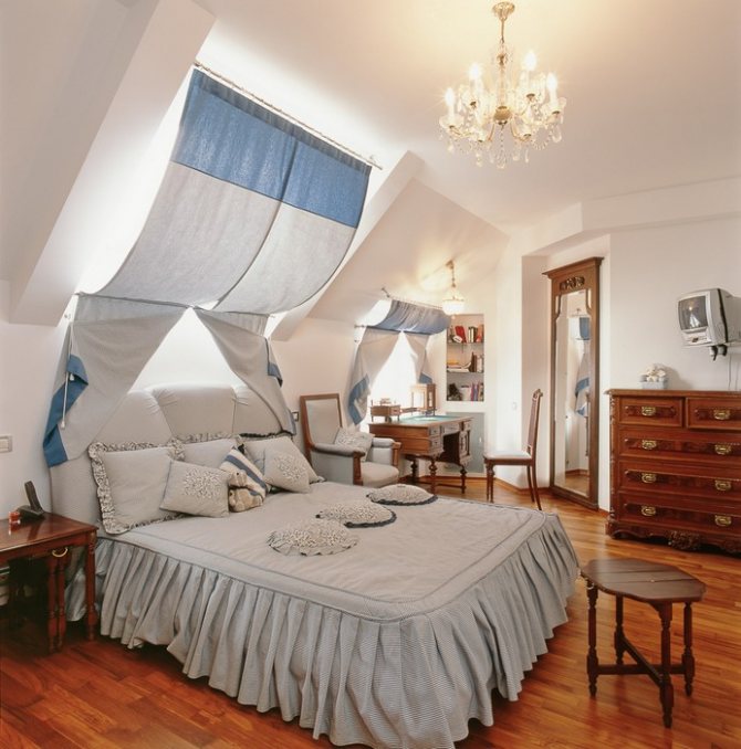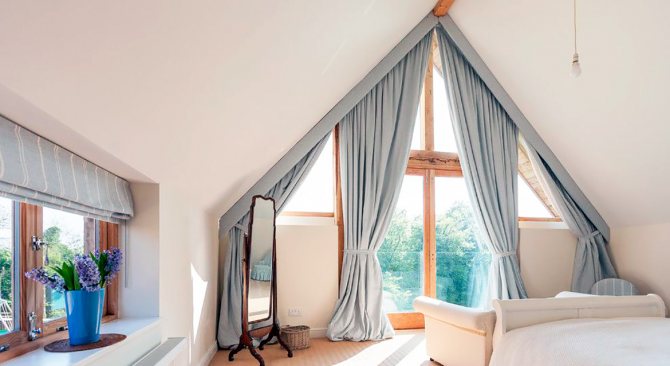 Si les fenêtres de votre grenier sont situées sur des murs verticaux, il n'y a aucun obstacle à privilégier la solution standard: une corniche laconique et des rideaux au sol sur les côtés de la fenêtre.