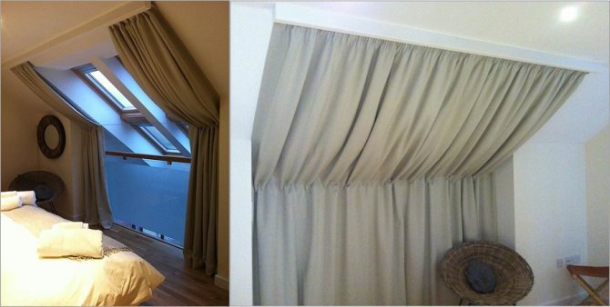 Tissu de rideau spécial, le tulle léger peut être utilisé comme rideau pour les puits de lumière. Les rideaux peuvent être fixés à l'aide de velcro ou de crochets décoratifs, qui peuvent être situés sur la tringle ou directement sur le mur. La fenêtre ouvrant sur le toit peut être décorée de rideaux et de deux corniches. Ils seront agités en haut et en bas de la fenêtre. Alternativement, de longs rideaux peuvent être suspendus sur des fenêtres biseautées, mais dans ce cas, pour qu'ils ne quittent pas le verre, des cordons décoratifs spéciaux sont utilisés. Les rideaux en tissu léger peuvent être fixés à l'aide d'un ruban adhésif spécial, qui est placé sur le plan incliné supérieur de la fenêtre.