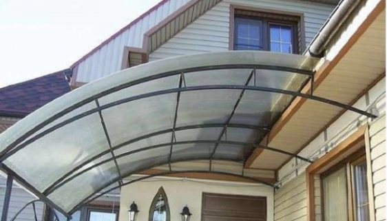 - Auvents modulaires ou cintrés. Un auvent de cette forme s'intégrera parfaitement dans la conception de n'importe quelle façade de la maison, il protège parfaitement des précipitations et du vent.