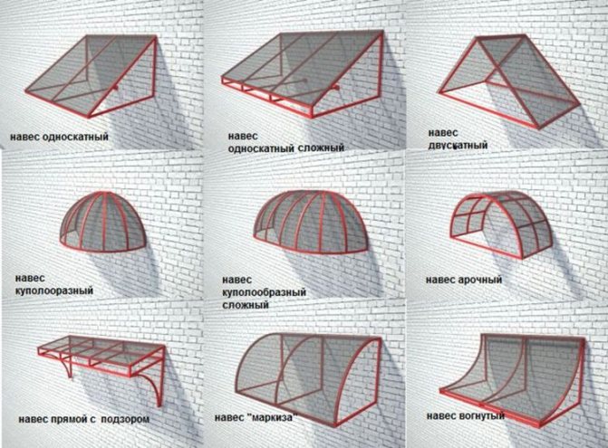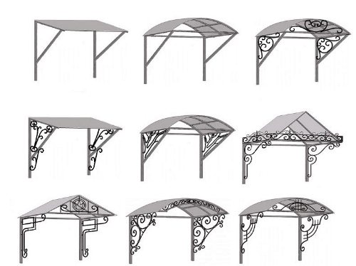 Aujourd'hui, sur le marché, il existe une grande variété de formes, de tailles et de styles de telles structures de protection, vous pouvez donc toujours choisir un auvent fonctionnel qui s'intègre parfaitement dans l'architecture de votre maison.