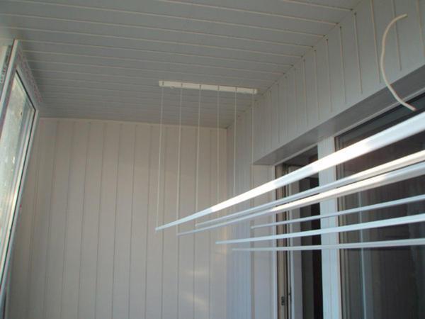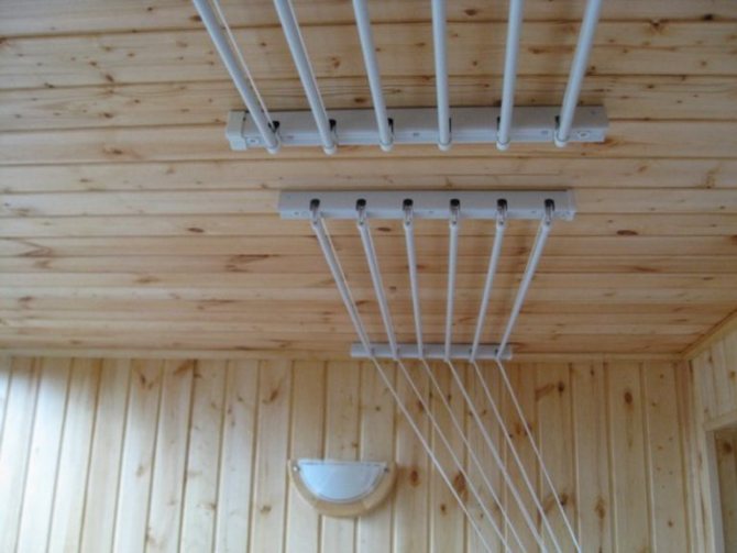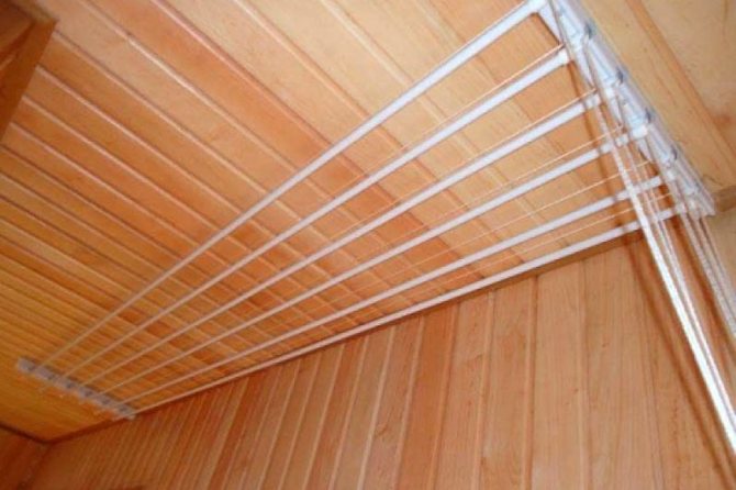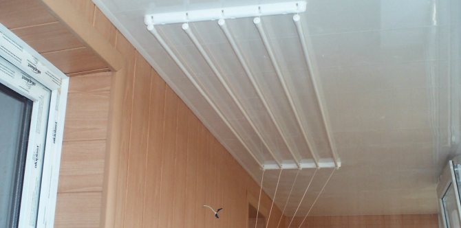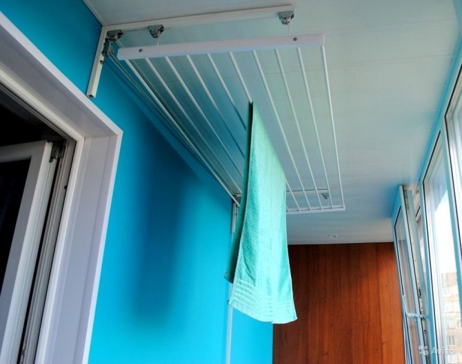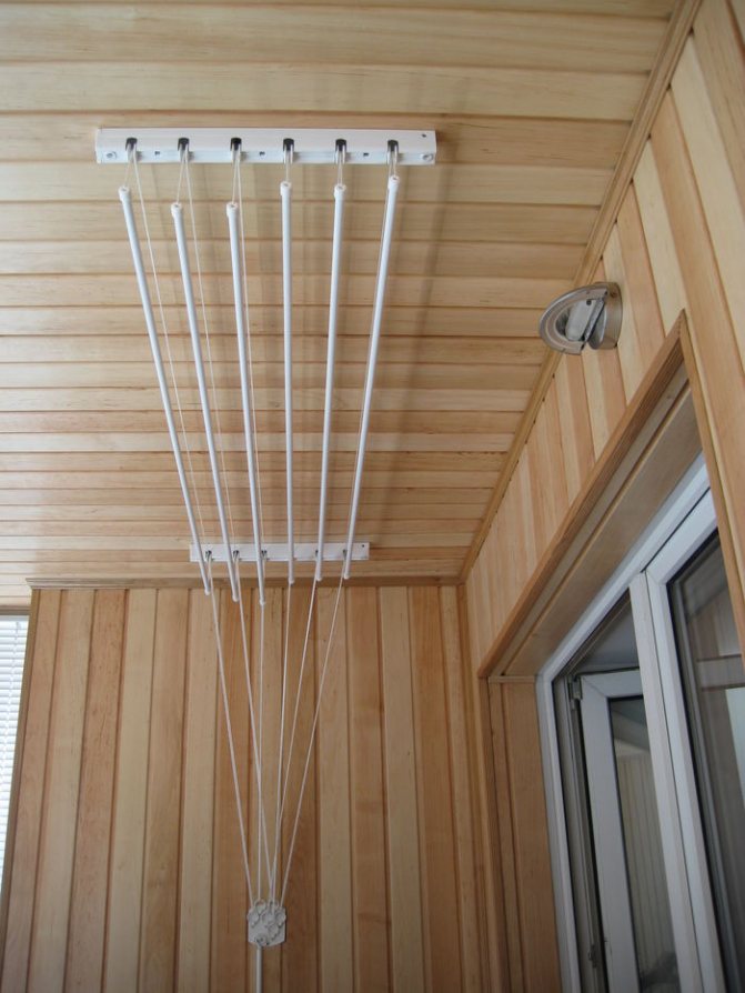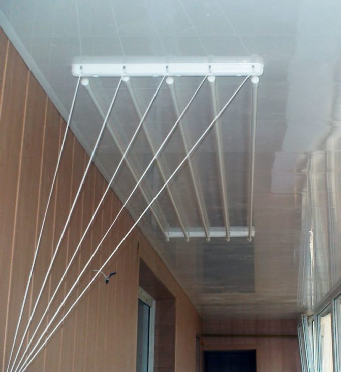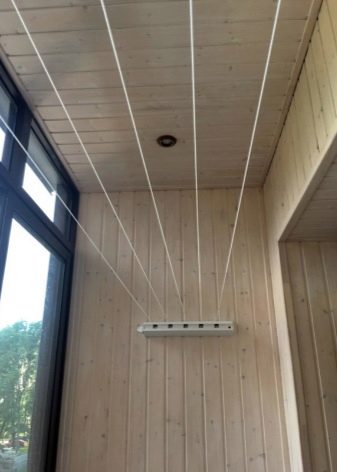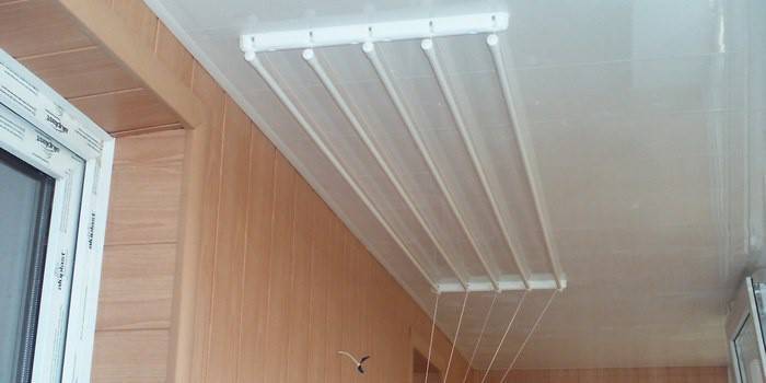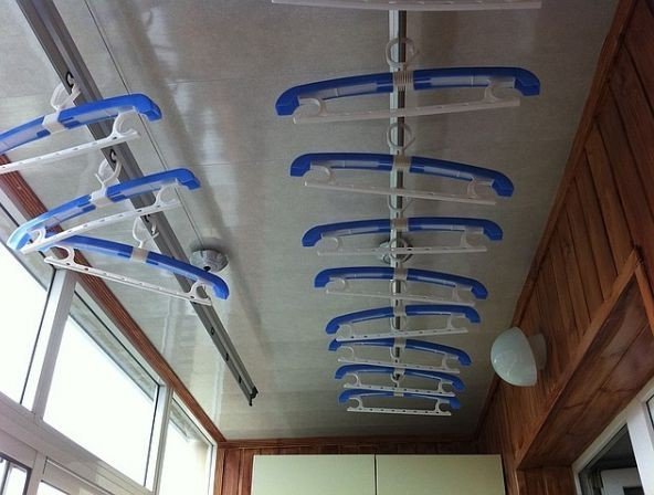 Les sèche-linge montés au plafond d'un balcon ou d'une loggia sont l'un des modèles les plus populaires. Ce sont deux lattes avec des barres transversales ou des cordes attachées, sur lesquelles le linge est suspendu.