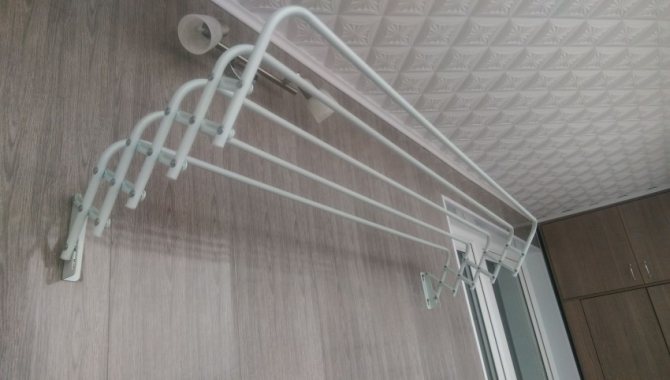 - Facile à utiliser. Un tel système fonctionne par analogie avec un ascenseur. En abaissant les planches à un niveau confortable, vous pouvez facilement et rapidement suspendre les articles lavés sans vous lever sur une chaise ou essayer de les atteindre. Une fois le linge suspendu, la barre est relevée à la hauteur souhaitée.