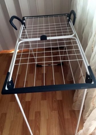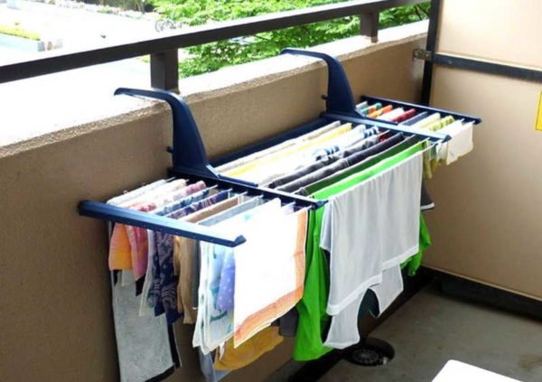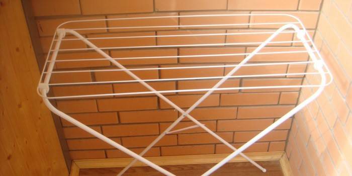 Équipé de deux ou trois crochets de grand diamètre qui vous permettent d'accrocher la structure à des cloisons horizontales, par exemple, une balustrade de balcon. Ils peuvent être placés à l'intérieur ou à l'extérieur, l'option est donc mobile et pratique. C'est juste que vous devez trouver un endroit pour le stockage ou faire des boucles sur le mur, pour lesquelles vous pouvez accrocher une sécheuse à charnière pour les vêtements.