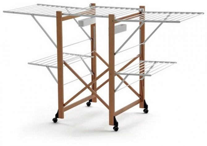 La deuxième option est plus facile à installer, moins chère, mais moins pratique. Toutes les planches sont à la même hauteur. Cela rend difficile le séchage du linge près du mur ou dans les rangées du milieu. Le deuxième point: une sécheuse chargée de linge humide n'est pas si facile à soulever.