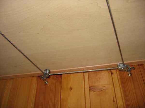 Au lieu de coins métalliques, des poutres en bois avec des crochets montés sont prises. Les barres sont fixées dans les coins opposés de la pièce. Le plus grand défi est de tirer la corde aussi uniformément que possible.