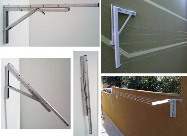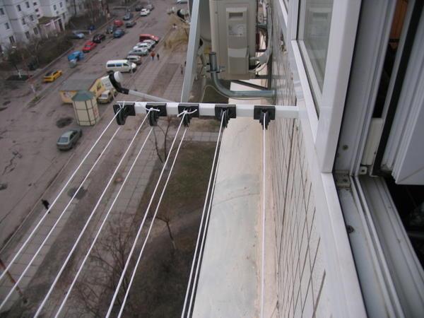 Pour un petit balcon, une fixation externe de cordes à linge est appropriée. Dans ce cas, vous n'avez pas à sacrifier l'espace disponible. Les coins et les supports métalliques sont utilisés comme base pour le système de fixation de corde. Ils sont installés à un léger angle, ce qui réduit le nombre de difficultés au moment de suspendre et de retirer le linge lavé.