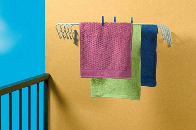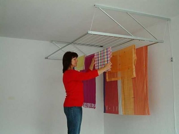 Pour sécher les objets dans les bâtiments de la ville à plusieurs étages, les cordes étaient auparavant principalement utilisées, qui étaient attachées à des structures en fer depuis l'extérieur du balcon. Cette option, bien sûr, économise de l'espace dans l'appartement. Cependant, les articles propres sur un tel sèche-linge peuvent facilement se salir de poussière ou tomber complètement de la corde. Des cordes à linge ordinaires peuvent également être fixées dans la pièce elle-même. Cependant, il est assez difficile de les organiser de manière optimale. Si la corde pèse trop haut, il sera difficile de suspendre et de retirer le linge. Lorsqu'ils sont placés bas, les vêtements peuvent gêner ou se salir en touchant d'autres objets dans la pièce ou sur le balcon. De plus, la poussière s'accumule assez rapidement sur les cordes et il ne sera pas possible de l'enlever complètement avec un simple chiffon humide.