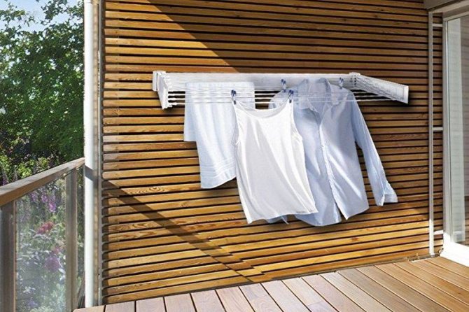 De plus, les séchoirs muraux pliants n'encombrent pas l'espace. Ils représentent un cadre avec des cordes tendues ou des tiges fixes. Le cadre est fixé de manière mobile directement à la paroi ou au corps. Il peut être fixé avec des butées, des bandes, des chaînes. Si vous souhaitez fabriquer vos propres mains un sèche-linge pour le balcon, ce sont les modèles les plus simples, les plus fiables et les plus compacts.