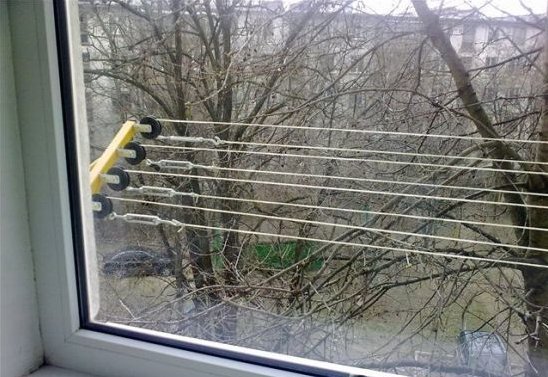Le modèle le plus célèbre est un séchoir mural pour balcon avec une ficelle fixée aux murs opposés. Dans les versions artisanales, les crochets sont enfoncés dans le mur ou une barre est attachée à laquelle tous les mêmes crochets sont fixés (il peut s'agir de clous pliés vers le haut). De la ficelle / des cordes fines sont tendues entre ces crochets. C'est une option bien connue de tout le monde. Loin du plus esthétique, mais le moins cher et le plus répandu.