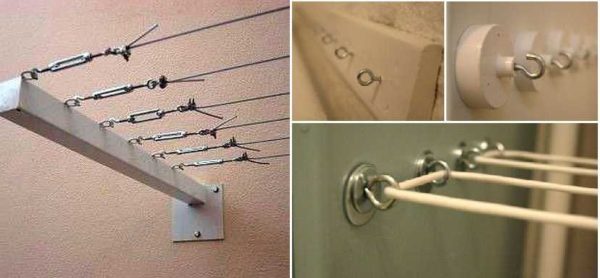 Les supports sont installés des deux côtés à l'aide de chevilles ou de vis autotaraudeuses. Ensuite, la corde à linge est tirée de manière à éviter tout affaissement évident.