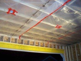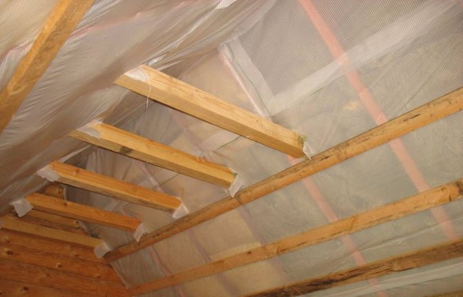 - Les poutres elles-mêmes et l'espace entre elles sont recouverts d'une feuille isolante. Le matériau est posé avec un chevauchement et les joints sont collés avec du ruban adhésif.