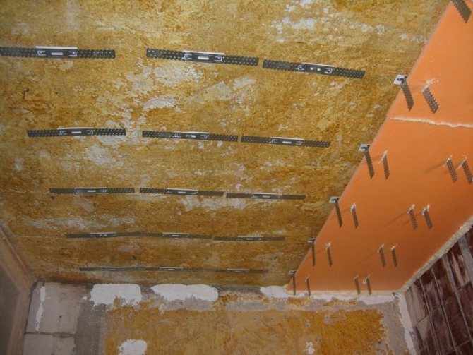 L'installation est effectuée exclusivement sur une surface préparée. Toutes les irrégularités doivent être nivelées, comblées et la surface du plafond doit être apprêtée. Le cadre est créé par la disposition transversale et longitudinale des profilés, qui sont fixés les uns aux autres et au plafond avec des vis ou des clous.