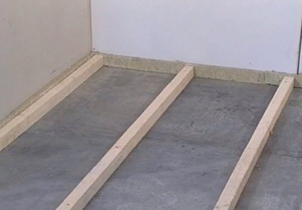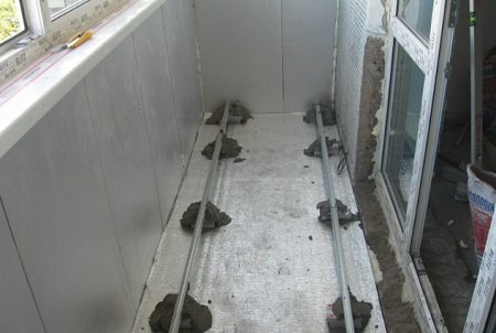 - Le niveau zéro de la chape est déterminé, après quoi des bûches de bois traitées avec un antiseptique sont installées sur le balcon sur des boulons d'ancrage pour éviter la pourriture.