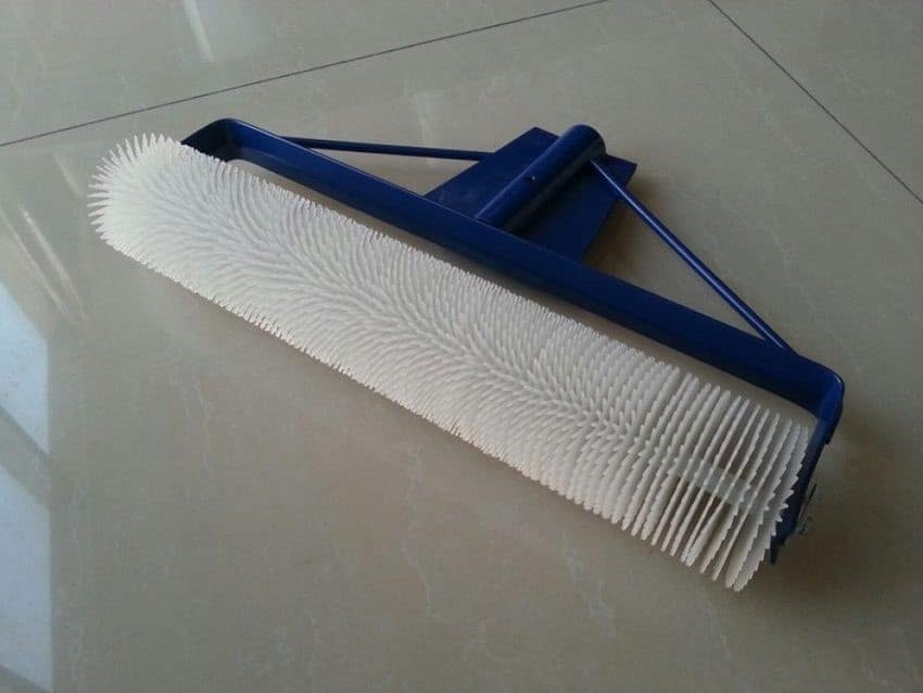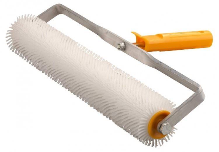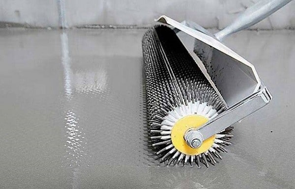 Nous roulons la chape coulée avec un rouleau à aiguilles sur toute la surface pour éliminer les bulles d'air.