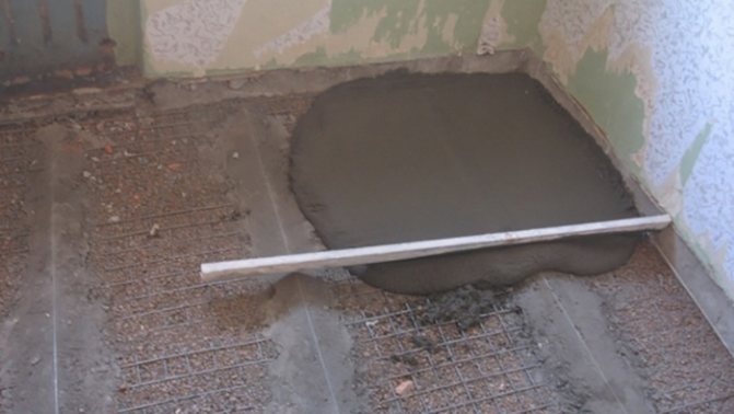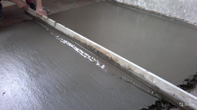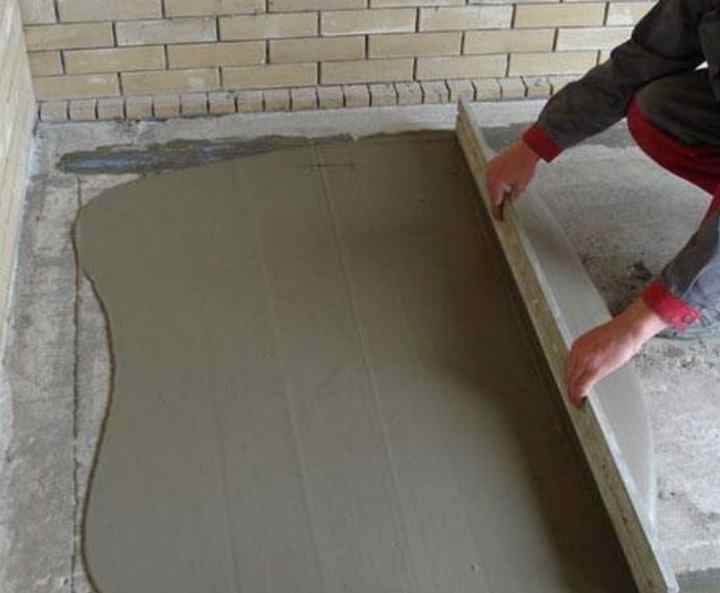 - La solution est versée en petites portions depuis la paroi opposée à la porte. Lors du coulage avec une règle de construction ou une planche lisse, la couche de chape est nivelée.