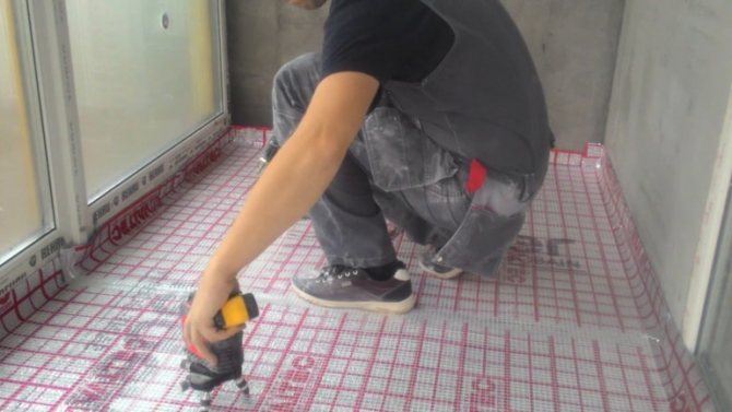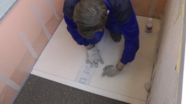 - Une feuille d'étanchéité est posée sur la dalle de balcon préparée. Ses extrémités sont fixées sur les murs avec une feuille d'amortissement.
