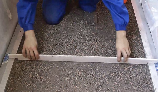 Entre les guides, nous remplissons l'argile expansée, le nivellement et le pilonnage en utilisant la règle.