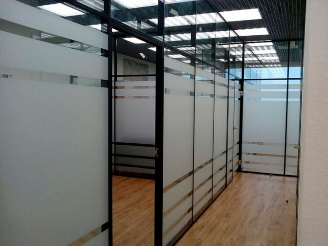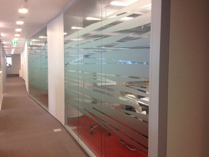 Dans les bureaux. Le verre teinté mat crée l'intimité et un environnement de travail confortable pour chaque employé, vous permet de mettre en valeur une salle de réunion ou de conférence.