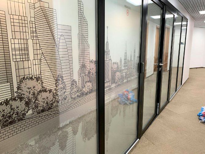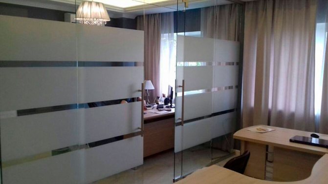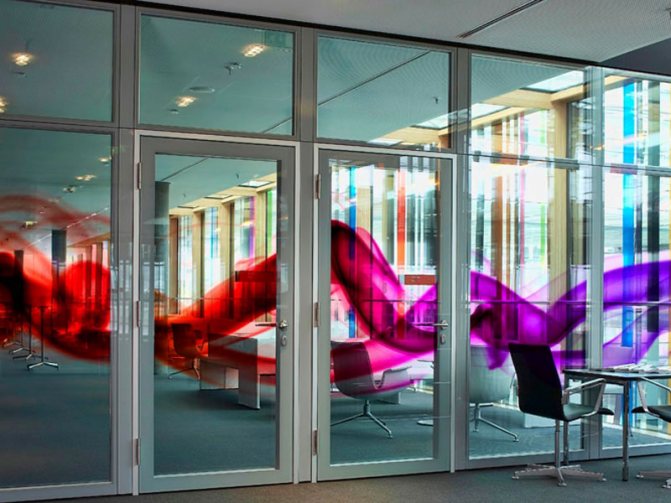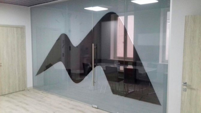 Dans les appartements et maisons. Un tapis de verre avec un film est réalisé pour zoner l'espace, décorer les portes, créer de l'intimité au rez-de-chaussée.