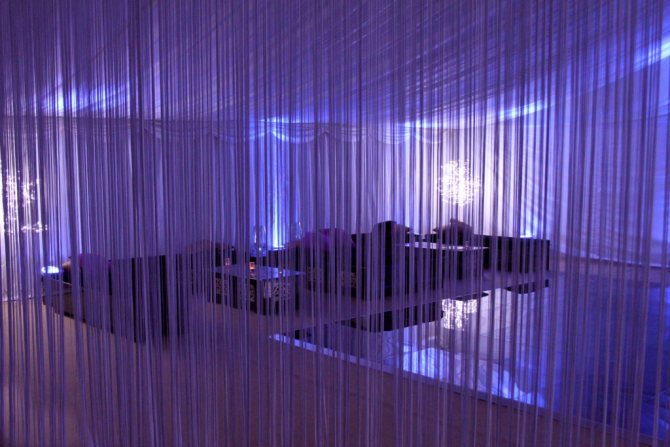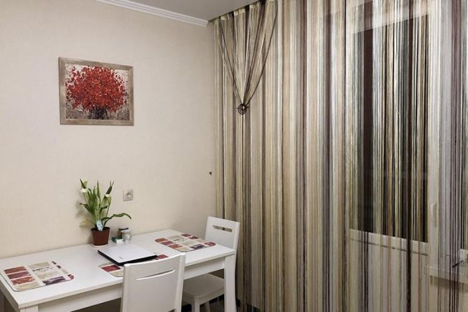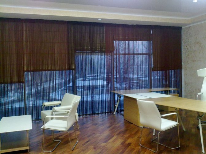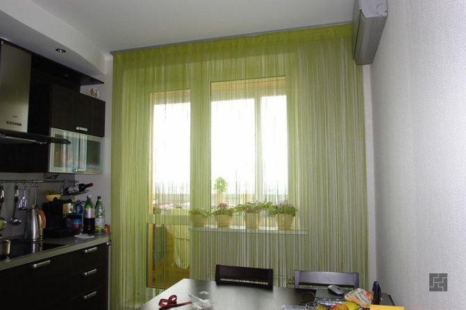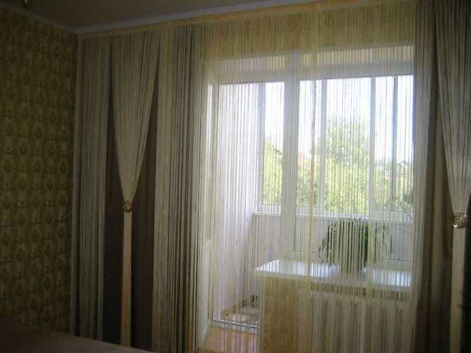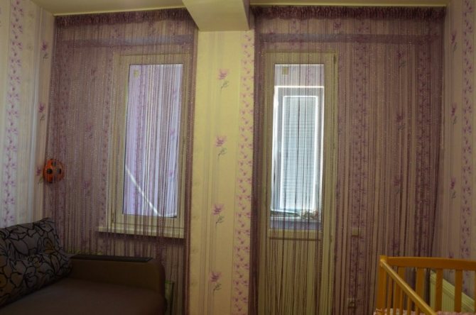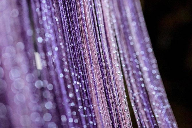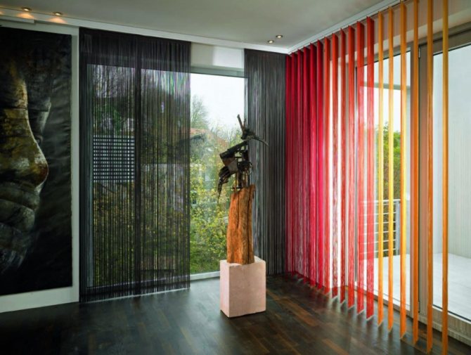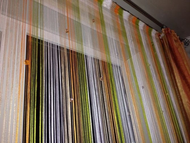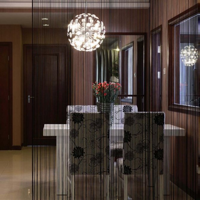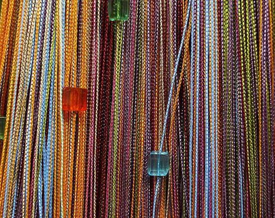 Les rideaux en filament peuvent être utilisés comme rideaux de fenêtre ou de porte. Il est courant de fixer des «nouilles» directement dans la pièce, divisant ainsi l'espace en zones fonctionnelles. Cette disposition convient aux studios d'une pièce ou aux halls spacieux.