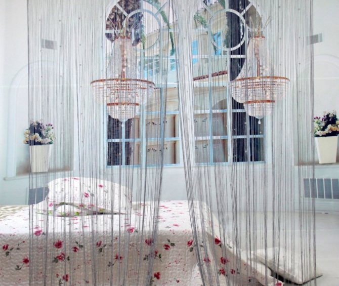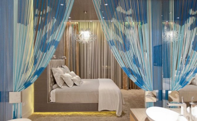 À l'aide de rideaux en fil, vous pouvez décorer la pièce. Par exemple, créez un auvent sur le lit ou décorez le salon.