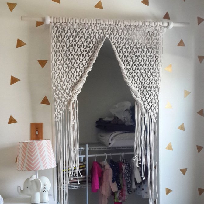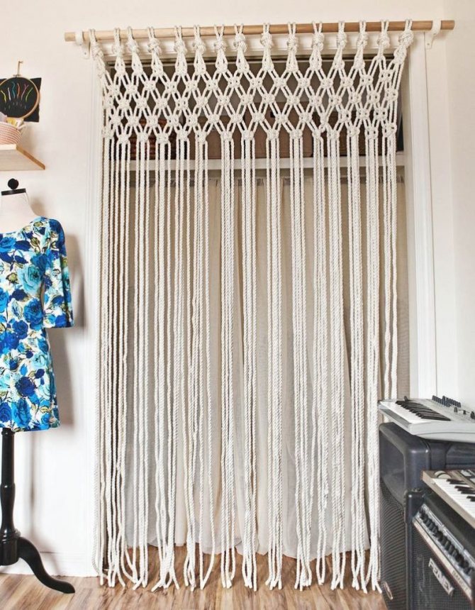 Les portes peuvent également être décorées avec des rideaux originaux. Ils ne doivent pas être constitués d'une toile solide, mais d'éléments suspendus séparément. Vous pouvez les disposer sous la forme d'une frange ordinaire décorée de perles ou de tresses torsadées. Les rideaux des portes doivent être assez lourds et résistants, il est donc préférable de les tricoter avec de la ficelle épaisse.
