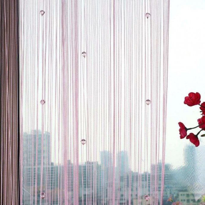 Pour les rideaux avec des inserts solides, il est préférable de choisir des fils suffisamment épais. Sur eux, les bijoux tiendront de manière plus fiable.