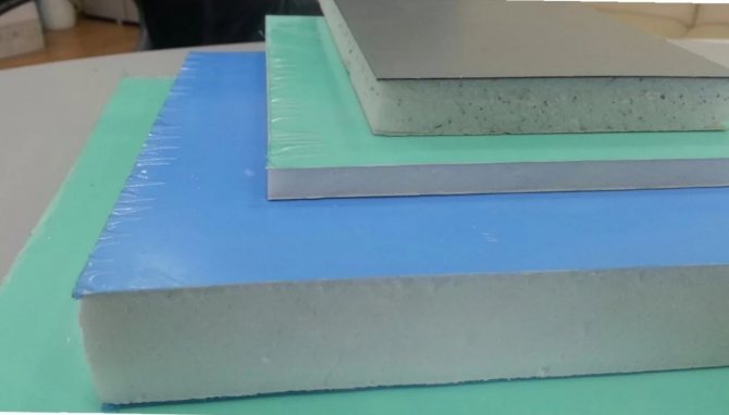 Les panneaux sandwich portent le nom du sandwich anglais. Ce sont 2 couches de plastique avec une isolation entre elles. En règle générale, il y a de la mousse de polystyrène extrudé ou de la mousse de polystyrène à l'intérieur, qui ont une très faible conductivité thermique.