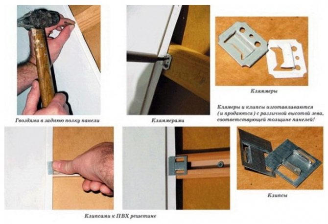 Les panneaux en PVC ont une pointe et une rainure sur les bords, à l'aide de laquelle ils sont reliés séquentiellement par analogie avec un clins en bois. La fixation des éléments peut être réalisée de deux manières: sur un cadre spécial (caisse) ou directement sur le mur à l'aide de colle.